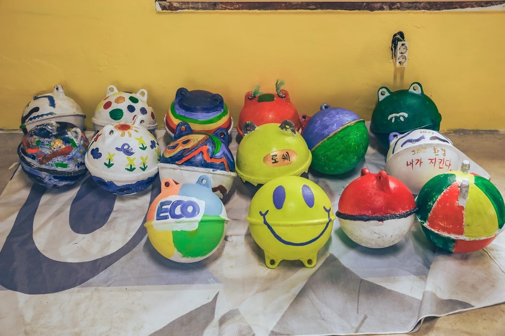 꽃을 품은 알록달록 폐타이어, 폐부표로 만든 '바담깨비' 눈길