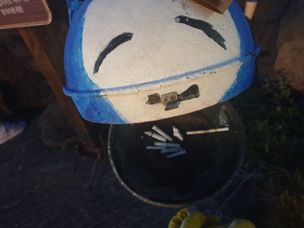 | ▲ 제주시 조천함덕해안도로에 설치된 바담깨비에 버려진 담배꽁초 [제주지역 환경단체 '작은 것이 아름답다' 제공. 재판매 및 DB 금지] |