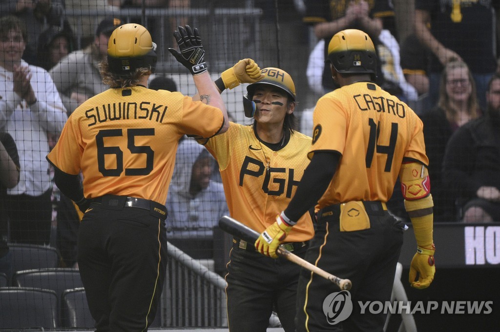 | ▲ 홈런 친 스윈스키를 환영하는 배지환(가운데) [AP=연합뉴스] |