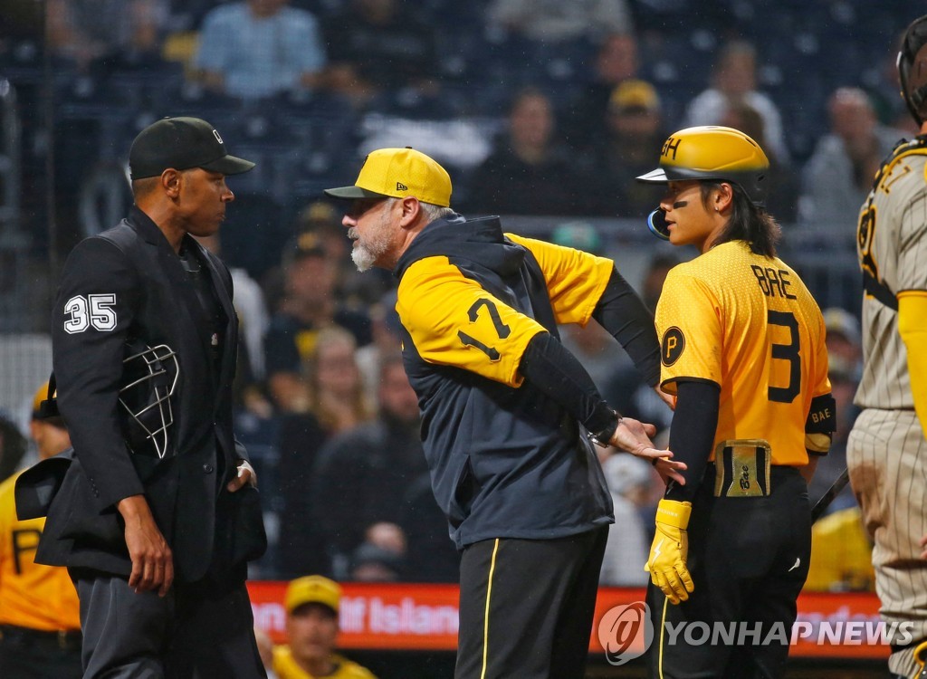 | ▲ 배지환과 심판의 언쟁 막는 셸턴 피츠버그 감독 [게티이미지/AFP=연합뉴스] |