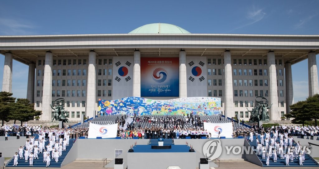 | ▲ 취임식 식전행사 마치고 인사하는 공연단원들 (서울=연합뉴스) 하사헌 기자 = 원주다이내믹댄싱카니발 학생 연합 치어리딩 등 공연단원들이 10일 오전 서울 여의도 국회 본관 앞에서 열린 제20대 대통령 취임식에서 식전행사를 마친 후 인사하고 있다. 2022.5.10 [국회사진기자단] toadboy@yna.co.kr |