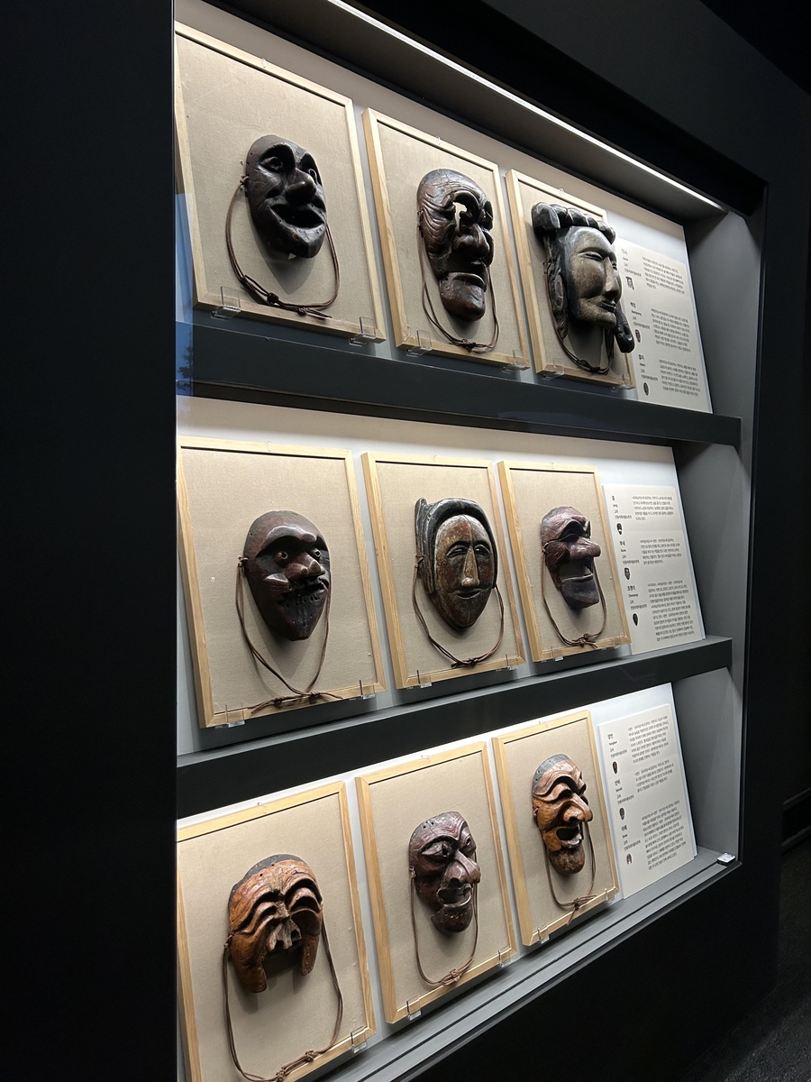 기존의 탈 전시와 달리 말뚝이 대 양반, 할미 대 영감 등으로 주제를 나눠 전시한 점이 돋보인다.
