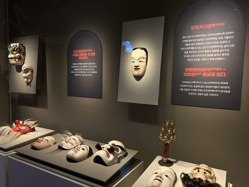 일본의 신 가운데 가장 높은 신인 아마테라스 오미카미(天照大神), 바다의 신이자 폭풍의 신인 스사노오(須佐男命) 등 일본 국립역사민속박물관이 소장한 가구라 가면 복제품 등이 소개된다.