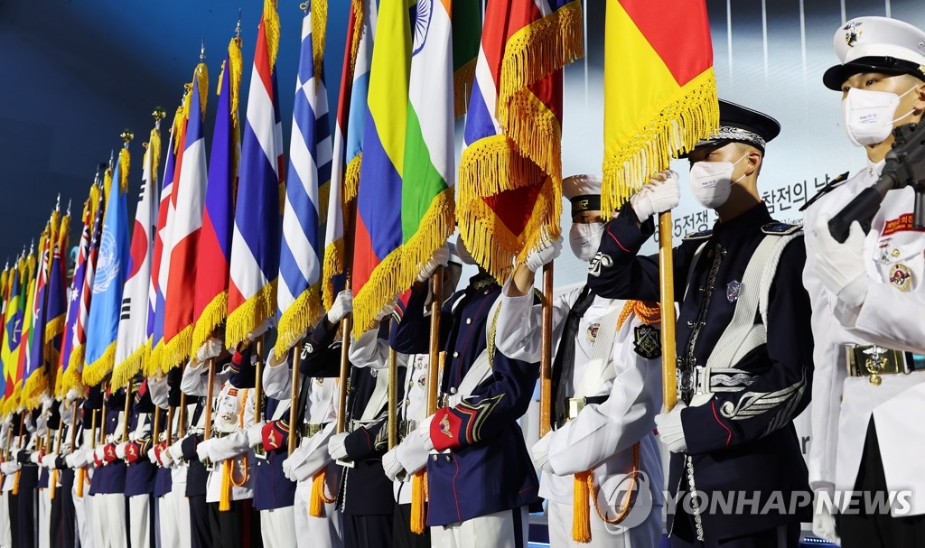 The national flags of the 22 countries that helped South Korea in the war then appeared alongside those of South Korea and the United Nations. Various performances were also staged in honor of those who fought under the U.N. banner during the three-year conflict.
