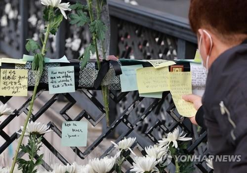 | ▲ A man posts a condolence message on Nov. 1, 2022, near Itaewon Station for those killed in the Halloween crowd crush in the neighborhood three days ago. (Yonhap) |