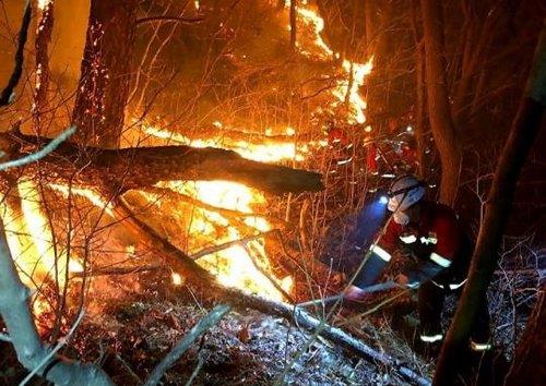 | ▲ Firefighters work to put out wildfires at Mount Jiri National Park in Hadong, South Gyeongsng Province, on March 11, 2023, in this photo provided by the Korea Forest Service. (PHOTO NOT FOR SALE) (Yonhap) |
