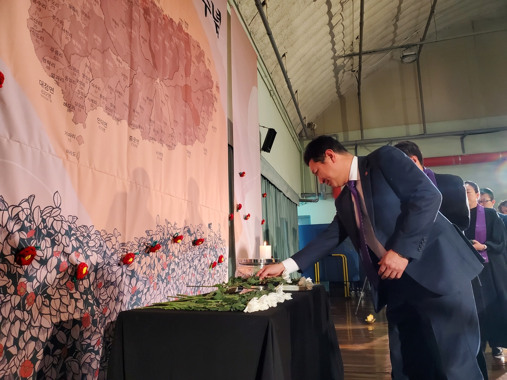 | ▲ 제주 4·3 희생자 추모 헌화 (서울=연합뉴스) 이세원 기자 = 한국기독교교회협의회(NCCK)가 3일 서울 강서구 소재 탐라영재관에서 개최한 '제주 4·3 75주년 아픈 역사의 정의로운 해결과 치유를 위한 개신교 추모기도회'에서 참가자들이 헌화하고 있다. 2023.4.3 |