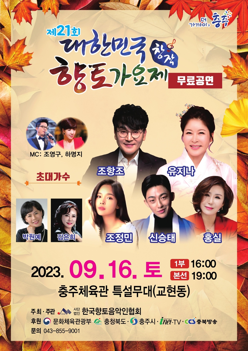 (충주=연합뉴스) 권정상 기자 = 제21회 대한민국 창작 향토가요제가 오는 16일 오후 7시 충북 충주시 충주체육관 특설무대에서 진행된다.