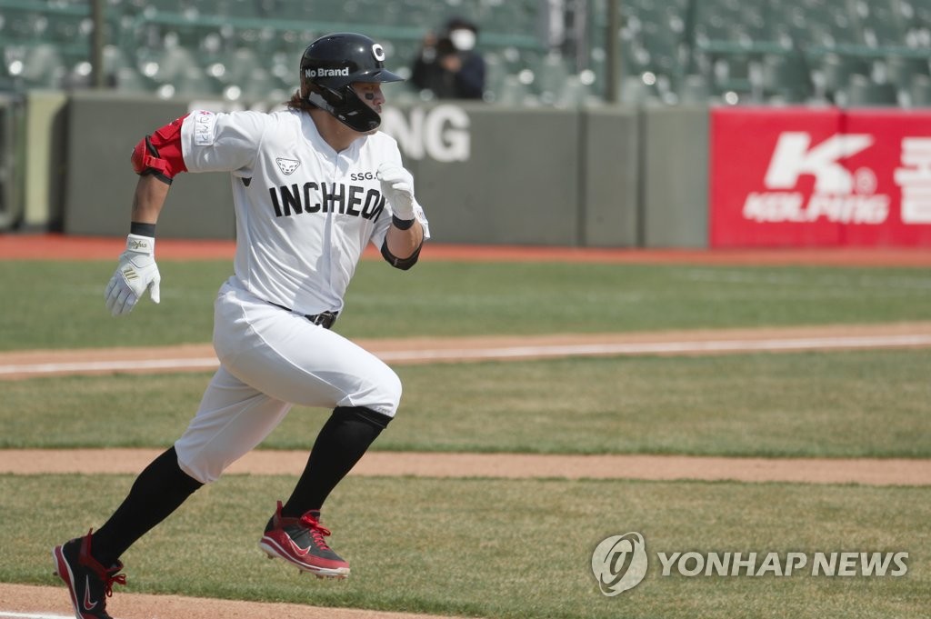 | ▲ Choo Shin-soo of the SSG Landers runs to first base after hitting a two-run single against the Lotte Giants in the top of the third inning of a Korea Baseball Organization preseason game at Sajik Stadium in Busan, 450 kilometers southeast of Seoul, on March 23, 2021. (Yonhap) |