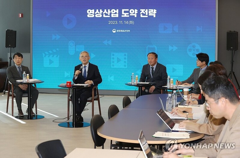 ▲ 유인촌 장관, 영상산업 도약 전략 발표 (서울=연합뉴스) 이재희 기자 = 유인촌 문화체육관광부 장관이 14일 오전 서울 서대문구 모두예술극장에서 영상산업 도약 전략을 발표하고 있다. 2023.11.14 scape@yna.co.kr