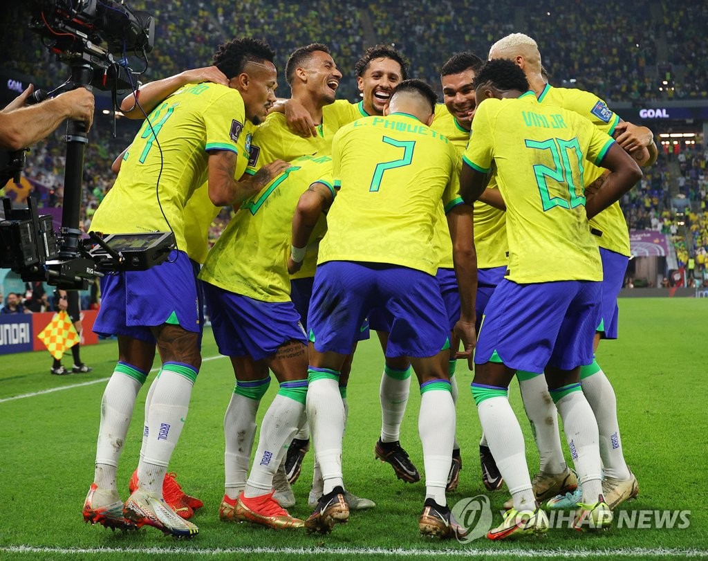 | ▲ 세리머니하는 브라질 선수들 (도하=연합뉴스) 김도훈 기자 = 6일(한국시간) 카타르 도하 974 스타디움에서 열린 2022 카타르 월드컵 16강전 대한민국과 브라질의 경기. 브라질 루카스 파케타(7번)의 득점 후 선수들이 세리머니를 하고 있다. 2022.12.6 superdoo82@yna.co.kr |