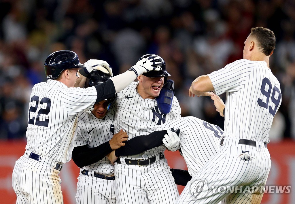 | ▲ 조시 도널드슨의 끝내기 안타에 기뻐하는 양키스 선수들 [AFP=연합뉴스] |