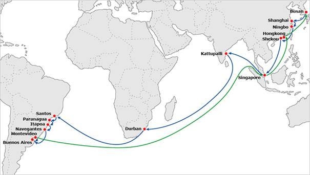 ▲ This image provided by HMM Co. on Oct. 20, 2021 shows the route liking South Korea and South America for the shipper's new container shipping service. (PHOTO NOT FOR SALE) (Yonhap) |