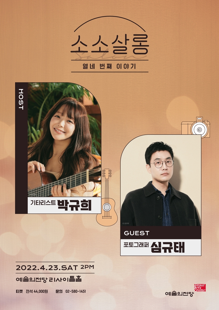 ▲ 박규희-심규태 대담 '소소살롱' = 예술의전당은 23일 오후 2시 음악당 리사이틀홀에서 클래식 기타리스트 박규희와 포토그래퍼 심규태가 함께하는 대담 프로그램 '소소살롱'을 진행한다.