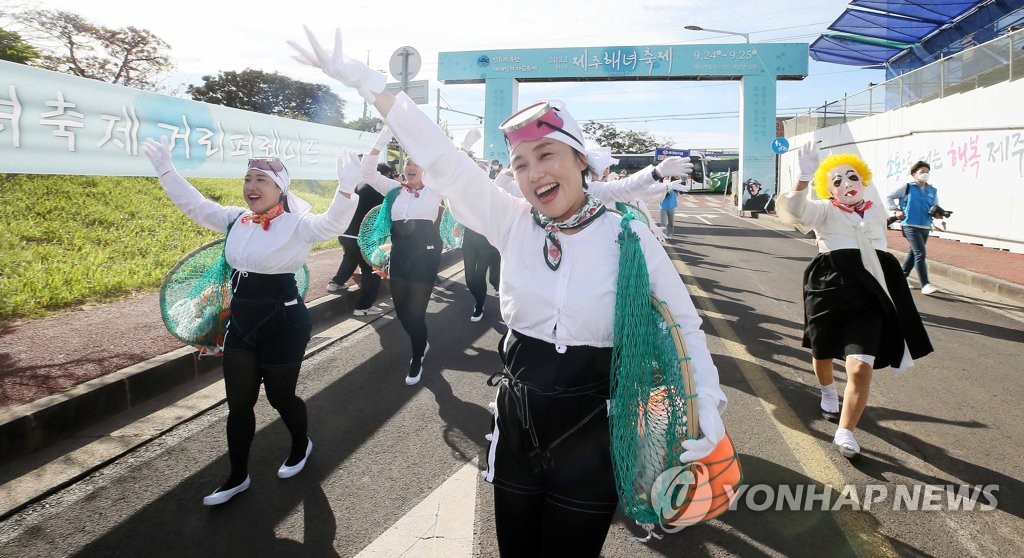 | ▲ 다시 돌아온 제주 해녀축제 (제주=연합뉴스) 변지철 기자 = 24일 제주시 구좌읍 세화리 제주해녀박물관 일대에서 제15회 제주해녀축제가 4년 만에 개최됐다. 공식 행사에 앞서 해녀들이 개막을 알리는 거리행진을 펼치고 있다. 2007년부터 매년 개최된 제주 해녀 축제는 2019년 태풍 타파와 2020년·2021년 코로나19 확산으로 취소됐다. 2022.9.24 bjc@yna.co.kr |