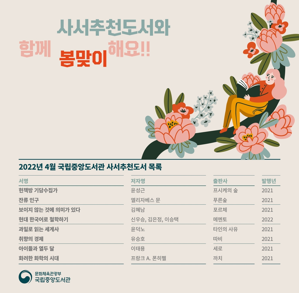 ▲ 국립중앙도서관 4월 '사서 추천 도서' 발표 = 국립중앙도서관은 4월 '사서 추천 도서' 8권을 선정해 발표했다.