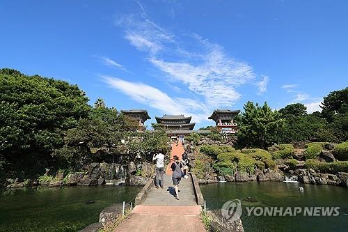 ▲ 새파란 가을 하늘 아래 약천사 탐방 (서귀포=연합뉴스) 박지호 기자 = 14일 오전 제주 서귀포시 대포동 약천사를 찾은 관광객들이 경내를 둘러보고 있다. 2023.10.14