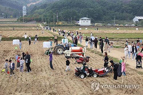 ▲ 동해 망상뜰에서 메뚜기 잡아요 (동해=연합뉴스) 14일 강원 동해시 초구동 망상뜰에서 열린 '제4회 망상 메뚜기 축제'에서 참가자들이 수확이 끝난 논에서 메뚜기를 잡고 있다. 2023.10.14 [동해시 제공. 재판매 및 DB 금지]