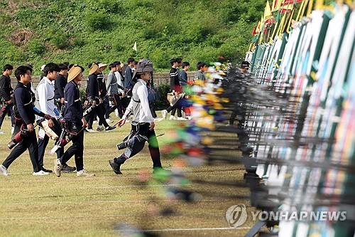 ▲ '나는 몇점?' (광주=연합뉴스) 정회성 기자 = 14일 오전 광주 국제양궁장에서 열린 제104회 전국체육대회 양궁 리커브 남자일반부 90m 예선 경기에 출전한 선수들이 표적지를 확인하기 위해 걸어가고 있다. 2023.10.14