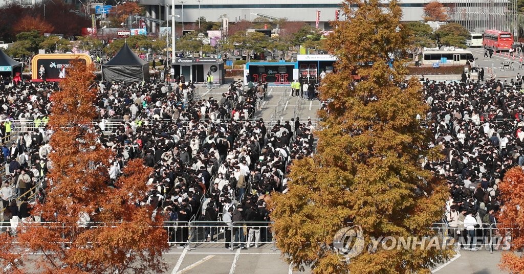 | ▲ 입장권 교환 '안전하게' (부산=연합뉴스) 손형주 기자 = 17일 부산 해운대구 벡스코에서 개막한 국내 최대 게임 전시회 지스타에서 사전예약한 관람객들이 입장권 교환을 하고 있다. 주최 측과 부산시, 경찰은 이태원 참사와 같은 안전사고 예방을 위해 안전관리 인력을 2배 늘리고 입장권 교환처와 입장 대기 공간을 분리했다. 구역별 입장 인원도 제한할 방침이다. 2022.11.17 handbrother@yna.co.kr |