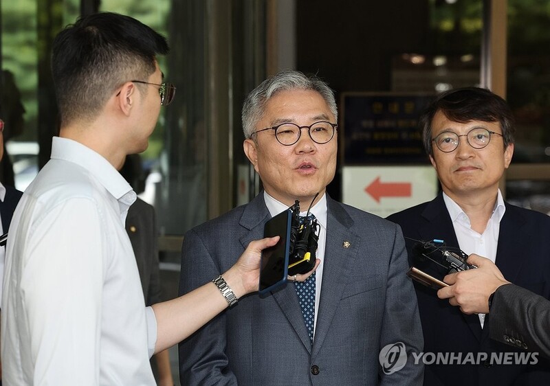 | ▲ Rep. Choe Kang-wook (C) of the main opposition Democratic Party speaks to reporters outside the Supreme Court in Seoul on Sept. 18, 2023, after the court upheld a suspended prison term for him for fabricating an internship certificate for the son of former Justice Minister Cho Kuk. (Yonhap) |