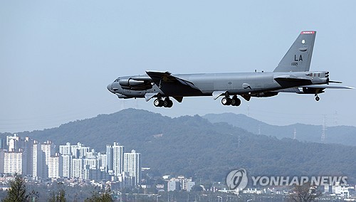SEOUL, Oct. 17 (Yonhap) -- A U.S. strategic bomber B-52 landed in South Korea for the first time Tuesday, after it staged a commemorative flight over a biennial defense trade show in the country and joint air drills with South Korean stealth fighter jets.