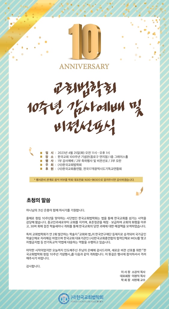 (서울=연합뉴스) 송광호 기자 = ▲ 한국교회법학회 창립 10주년 비전 선포식 = 한국교회법학회는 오는 25일 서울 종로구 연지동 한국교회100주년기념관에서 '창립 10주년 감사예배 및 비전 선포식'을 연다.