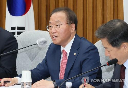 | ▲ People Power Party floor leader Yun Jae-ok speaks at a party meeting held at the National Assembly in Seoul on May 23, 2023. (Yonhap) |