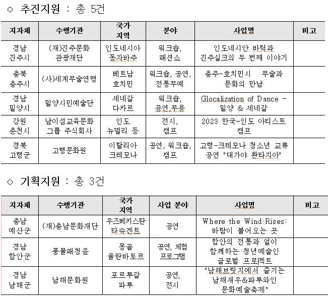 | ▲ '2023년 지역문화 국제교류 지원사업 공모' 선정 결과 [문화체육관광부 제공] |