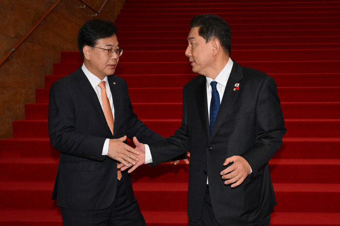 Democratic Party floor leader Rep. Kim Byung-kee (R) and People Power Party floor leader Rep. Song Eon-seog shake hands at the National Assembly in Seoul on Dec. 9, 2025, after their meeting with Assembly Speaker Woo Won-shik. (Pool photo) (Yonhap)