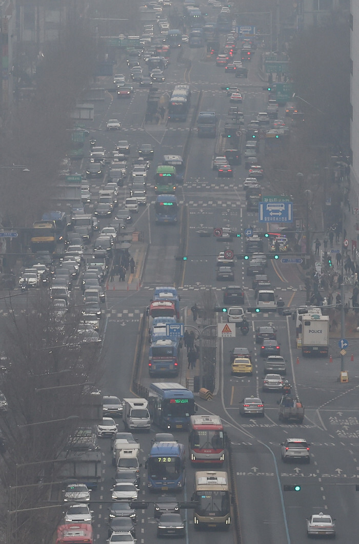 Buses run on a bus-only central lane on a road in Seoul's Jongno Ward on Jan. 15, 2026, after unionized intracity bus workers in the capital ended a two-day strike following the establishment of a collective wage deal with management. (Yonhap)
