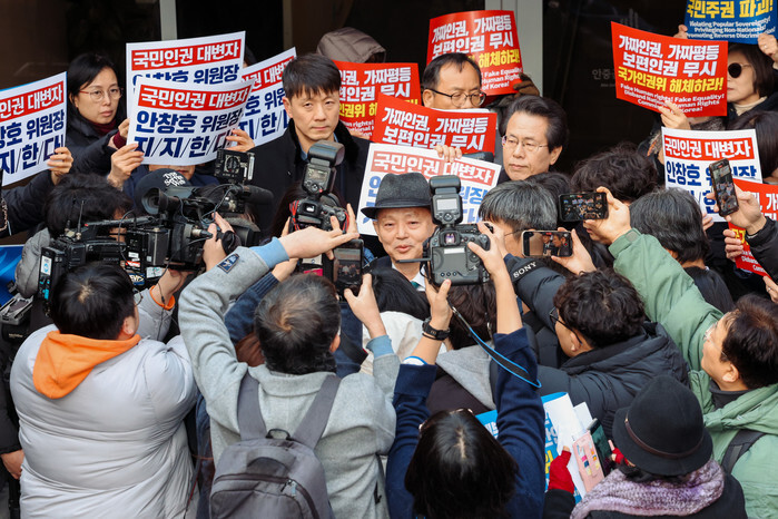 Ahn Chang-ho (C), chairperson of the National Human Rights Commission of Korea, is blocked by civic activists from attending the 2025 Human Rights Day ceremony at the Ahn Junggeun Memorial Museum in central Seoul on Dec. 10, 2025. (Pool photo) (Yonhap)
