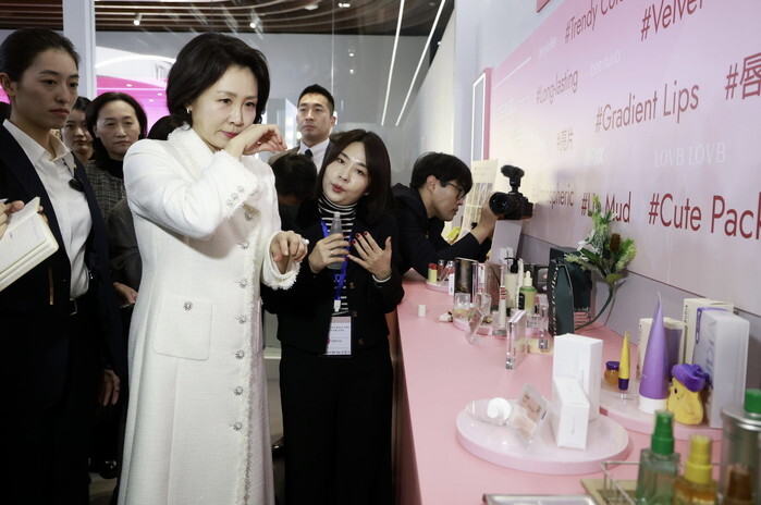 Kim Hea Kyung (C), wife of South Korean President Lee Jae Myung, attends an event to promote Korean beauty-related products in Shanghai on Jan. 7, 2026. Kim is accompanying Lee on his state visit to China. (Yonhap)