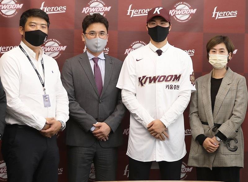 | ▲ 아버지 장정석 전 감독에 이어 키움 유니폼 입은 장재영 왼쪽부터 키움 이상원 스카우트 팀장, 장재영의 아버지 장정석 전 키움 감독, 장재영, 장재영의 어머니. [키움 히어로즈 제공, 재배포 및 DB 금지] photo@yna.co.kr |