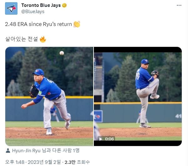 토론토 구단은 사회관계망서비스(SNS) X 계정에 한글로 '살아 있는 전설'이라고 쓰고 류현진이 역투하는 사진과 동영상을 올렸다. 아울러 복귀 후 평균자책점 2.48로 순항하는 류현진을 칭찬했다.