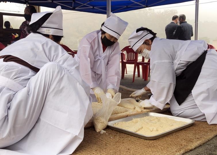 | ▲ 인절미 만드는 주민 (공주=연합뉴스) 5일 충남 공주시 우성면 목천2리 마을회관에서 열린 '떡 메치기 축제'에서 주민이 인절미를 만들고 있다. 2021.11.5 [공주시 제공. 재판매 및 DB 금지] |