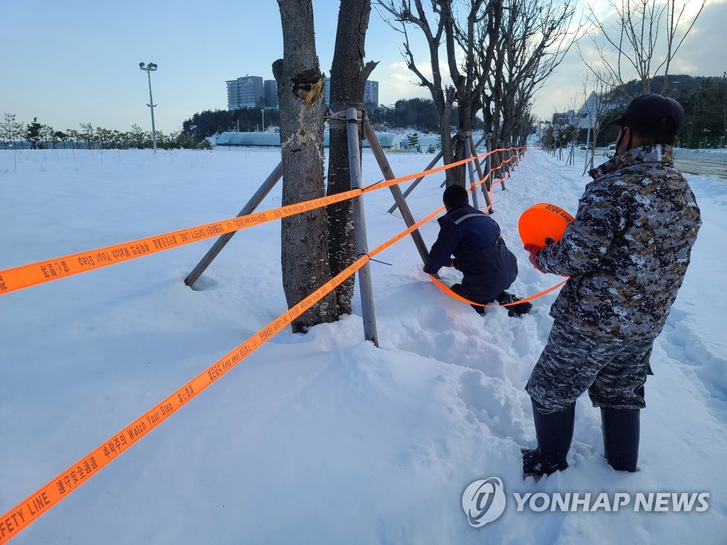 | ▲ 해맞이 인파 차단…속초해변 출입통제 (속초=연합뉴스) 이종건 기자 = 신종 코로나바이러스 감염증(코로나19) 확산 방지를 위한 해맞이 인파 집중을 막고자 오는 31일 오후 10시부터 1월 1일 오전 9까지 속초해수욕장 전 구간을 폐쇄하기로 한 속초시가 29일 해수욕장 주변에 출입통제용 안전선을 설치하고 있다. 2021.12.29 momo@yna.co.kr |