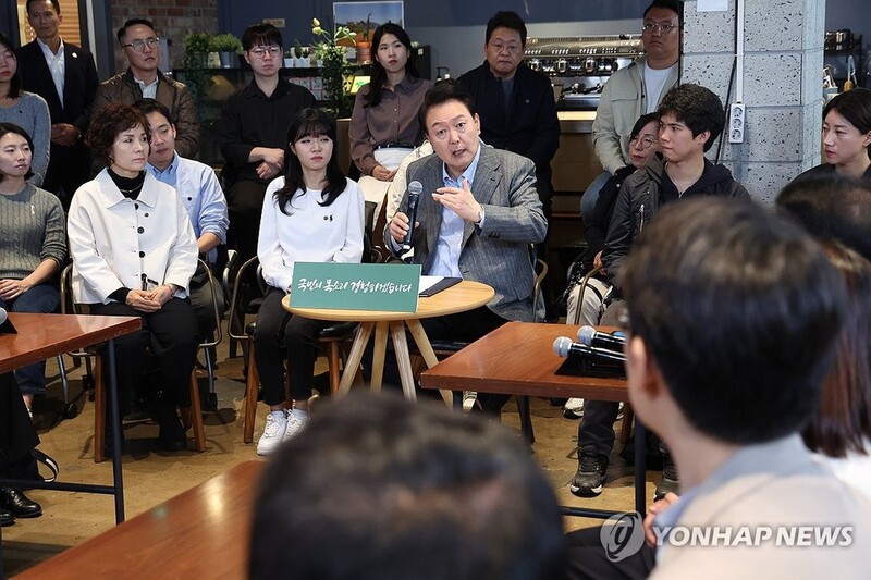 Yoon met with a group of around 60 citizens, including housewives, office workers and small business owners, to talk about public livelihood issues at a book cafe in Seoul's Mapo Ward. The gathering doubled as the 21st session of the emergency economic and public livelihood meeting led by Yoon.