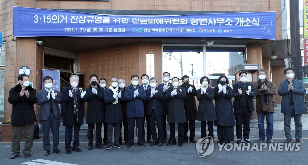 | ▲ 3·15의거 진상규명 창원사무소 개소식 1월 21일 경남 창원시 마산합포구 오동민원센터에서 열린 '3·15의거 진상규명을 위한 진실화해위원회 창원사무소' 개소식에서 현판식이 진행되고 있다. 이날 개소식에는 정근식 진실·화해를위한과거사정리위원회 위원장, 최형두 국민의힘 의원, 하병필 경남도지사 권한대행, 허성무 창원시장, 민주화 단체 대표 등이 참석했다. [연합뉴스 자료사진] |