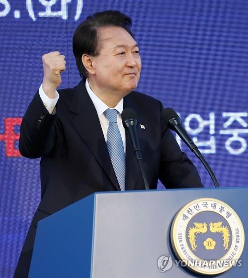 | ▲ President Yoon Suk Yeol raises his fist in a show of solidarity during an event at the presidential office in Seoul on May 23, 2023, to honor small and medium-sized enterprises that have made a significant contribution to the nation's economic development. (Pool photo) (Yonhap) |