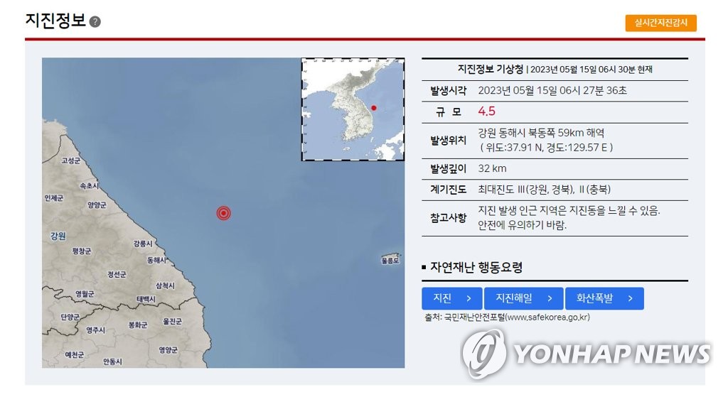 Early Monday, a 4.5 magnitude earthquake occurred in waters about 59 kilometers northeast of the eastern coastal city of Donghae, 182 kilometers east of Seoul, according to the Korea Meteorological Administration (KMA). There have been no reports of damage.