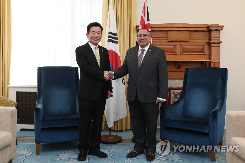 | ▲ South Korean National Assembly speaker Kim Jin-pyo (L) shakes hands with his New Zealand counterpart, Adrian Paki Rurawhe, in Wellington on June 28, 2023. (Yonhap) |
