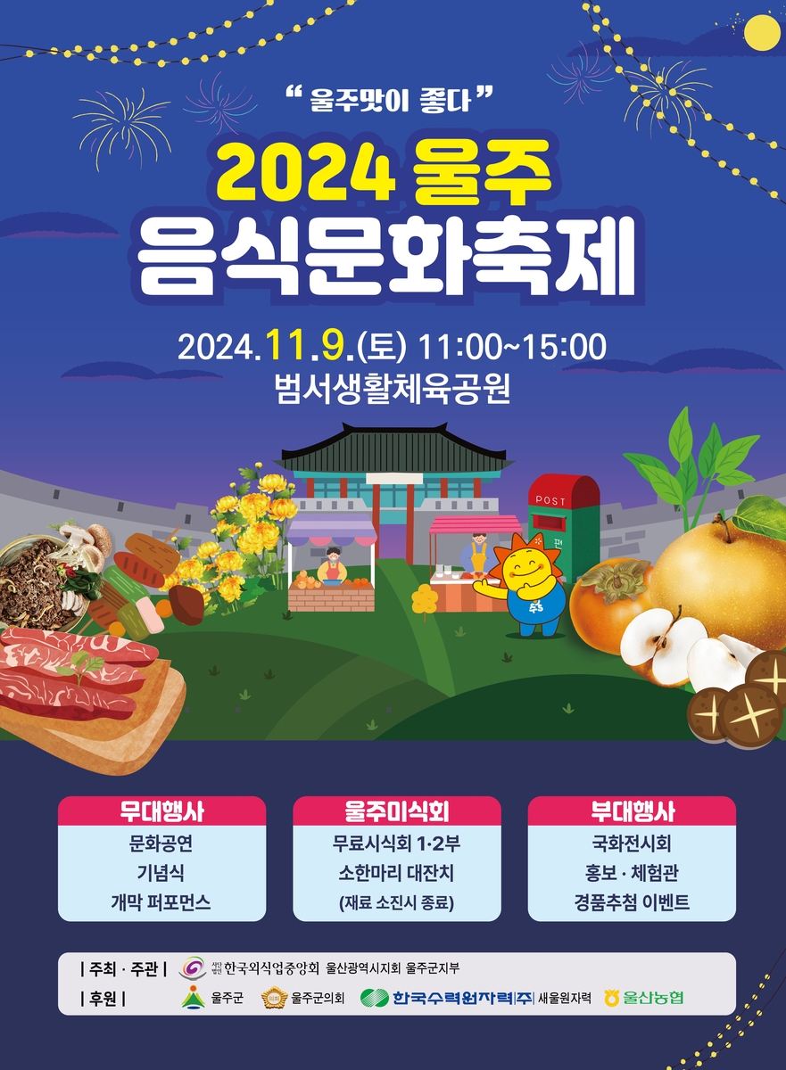 풍성한 맛을 느끼고 다양한 체험도 할 수 있는 '2024 울주음식문화축제'가 오는 9일 울산시 울주군 범서생활체육공원에서 막을 올린다.