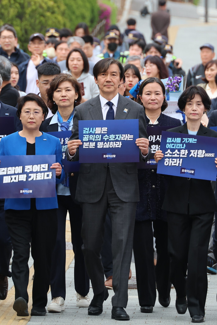 Victorious candidates of the minor Rebuilding Korea Party, including scandal-tainted former justice minister Cho Kuk (C), march after holding a news conference in front of the Supreme Prosecutors Office in Seoul on April 11, 2024, calling for a probe into allegations involving first lady Kim Keon Hee, including stock price manipulation. The move came just one day after the party grabbed 11 proportional representation seats in the general elections. Cho hastily launched the party on March 3, prior to the elections. (Yonhap)