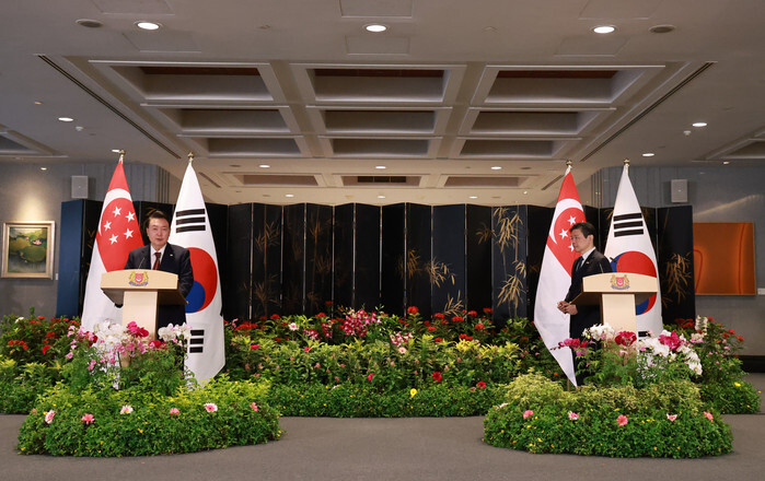 South Korean President Yoon Suk Yeol (L) issues a joint press statement with Singapore's Prime Minister Lawrence Wong after their talks at Parliament House in Singapore on Oct. 8, 2024. (Yonhap)