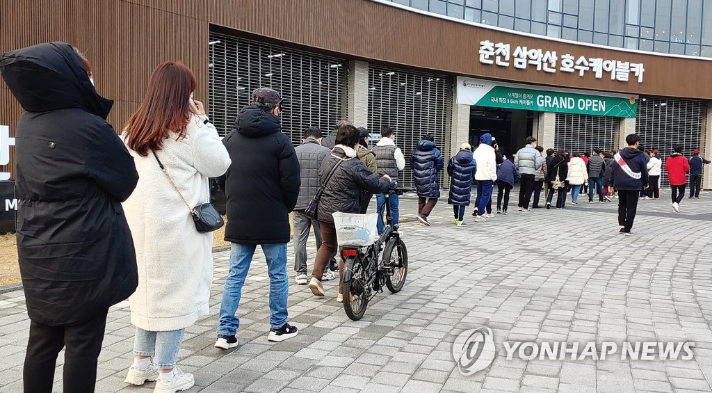 강원 춘천시 삼악산 호수 케이블카 매표소 앞에는 3.6km에 달하는 국내 최장 노선을 즐기려는 탑승객들이 이날 아침부터 긴 줄을 섰다. 이들은 케이블카 밑으로 펼쳐진 북한강 의암호를 내려다보다가 멋진 경관에 탄성을 지르기도 했다.