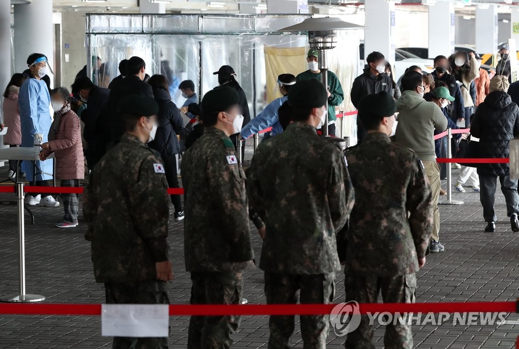 | ▲ Service members wait in line to receive COVID-19 tests at a gym in Wonju, 132 kilometers southeast of Seoul, on March 22, 2022. (Yonhap) |