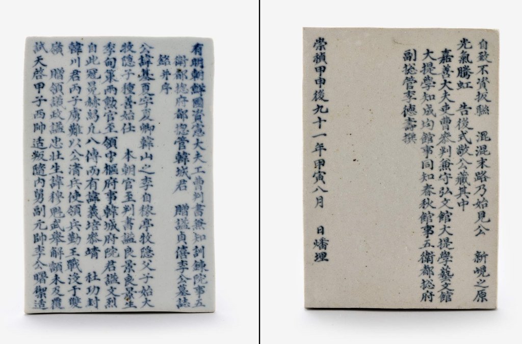 백토를 직사각형 판형으로 성형한 뒤, 청화 안료로 글씨를 새겨 조선시대 사대부 계층이 사용한 묘지의 정형을 보여준다.