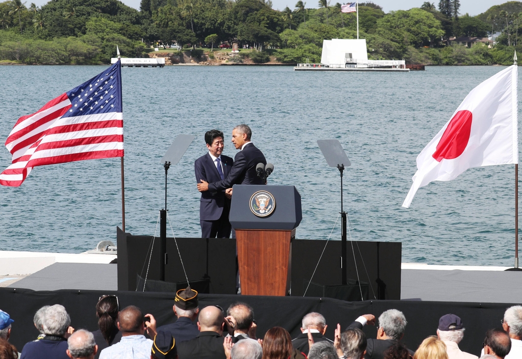 아베는 재임 중인 2016년 12월 버락 오바마 당시 미국 대통령과 함께 진주만을 방문해 "전쟁의 참화는 두 번 다시 되풀이하면 안 된다"고 말하고 "격렬한 전쟁을 하던 미일은 깊고 강하게 맺어진 동맹국이 됐다", "우리를 결합한 것은 관용의 마음이 가져온 '화해의 힘'"이라고 언급하는 등 미국과의 우호를 강조했다.