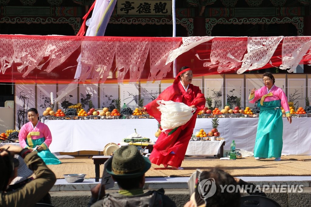 ▲ 무형문화재 제주큰굿 시연 (제주=연합뉴스) 2015년 10월 17일 제주목관아 관덕정 광장에서 제주도 무형문화재 제13호인 제주큰굿 공개 행사가 열리는 모습. [연합뉴스 자료사진]